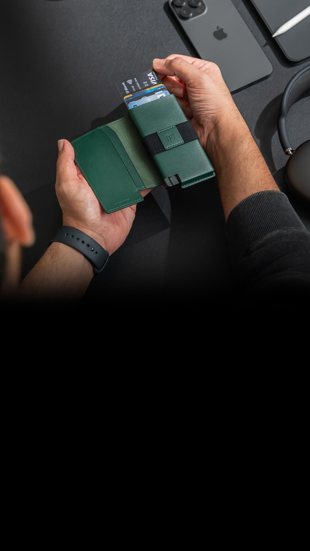 Our vegan cardholders and smart wallets give you quick card access at the push of a button, instantly fanning out your most-used cards.