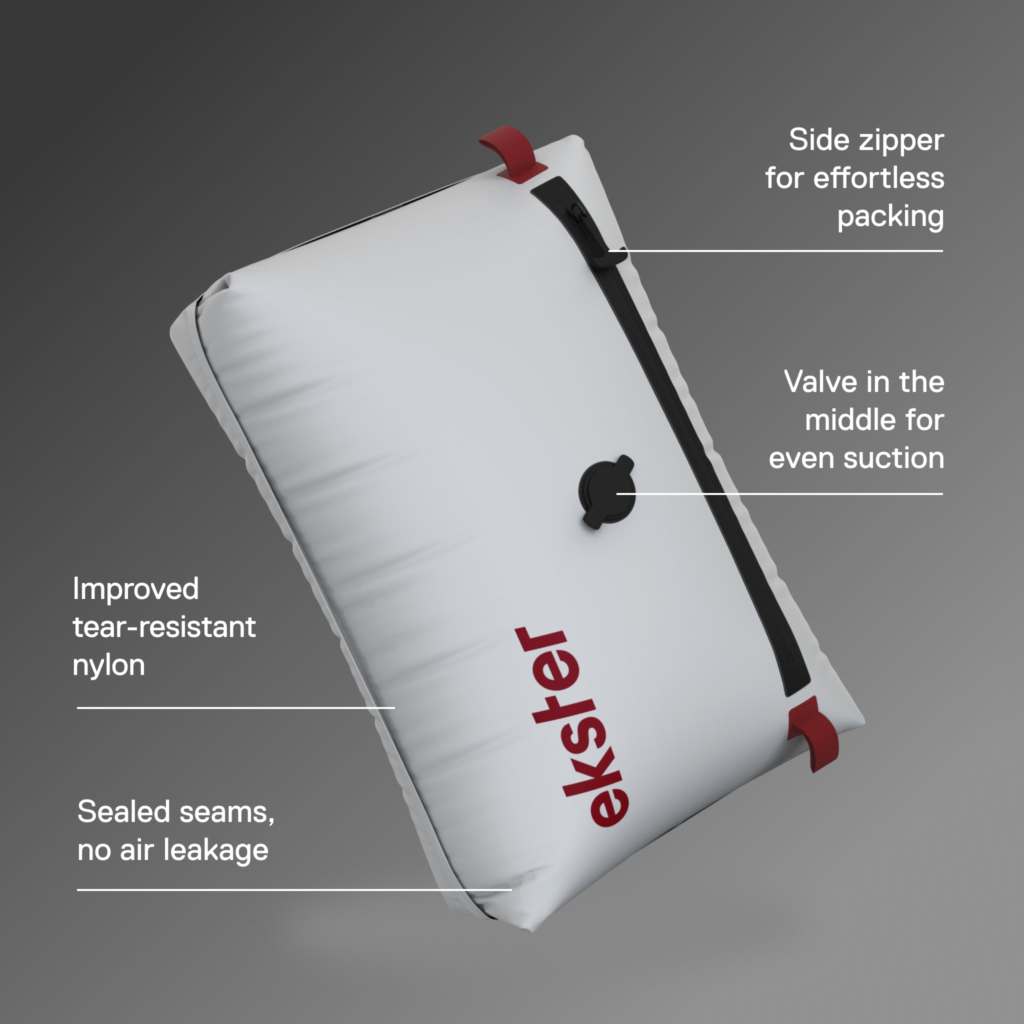 The Ekster TravelPack Vacuum Bags outperform cheap vacuum kits and are better than using no travel vacuum bags. Ekster's vacuum travel bags save packing space, fit in any size travel bag, keep clothes waterproof and odor-proof, and work with a portable air pump or any vacuum cleaner.
