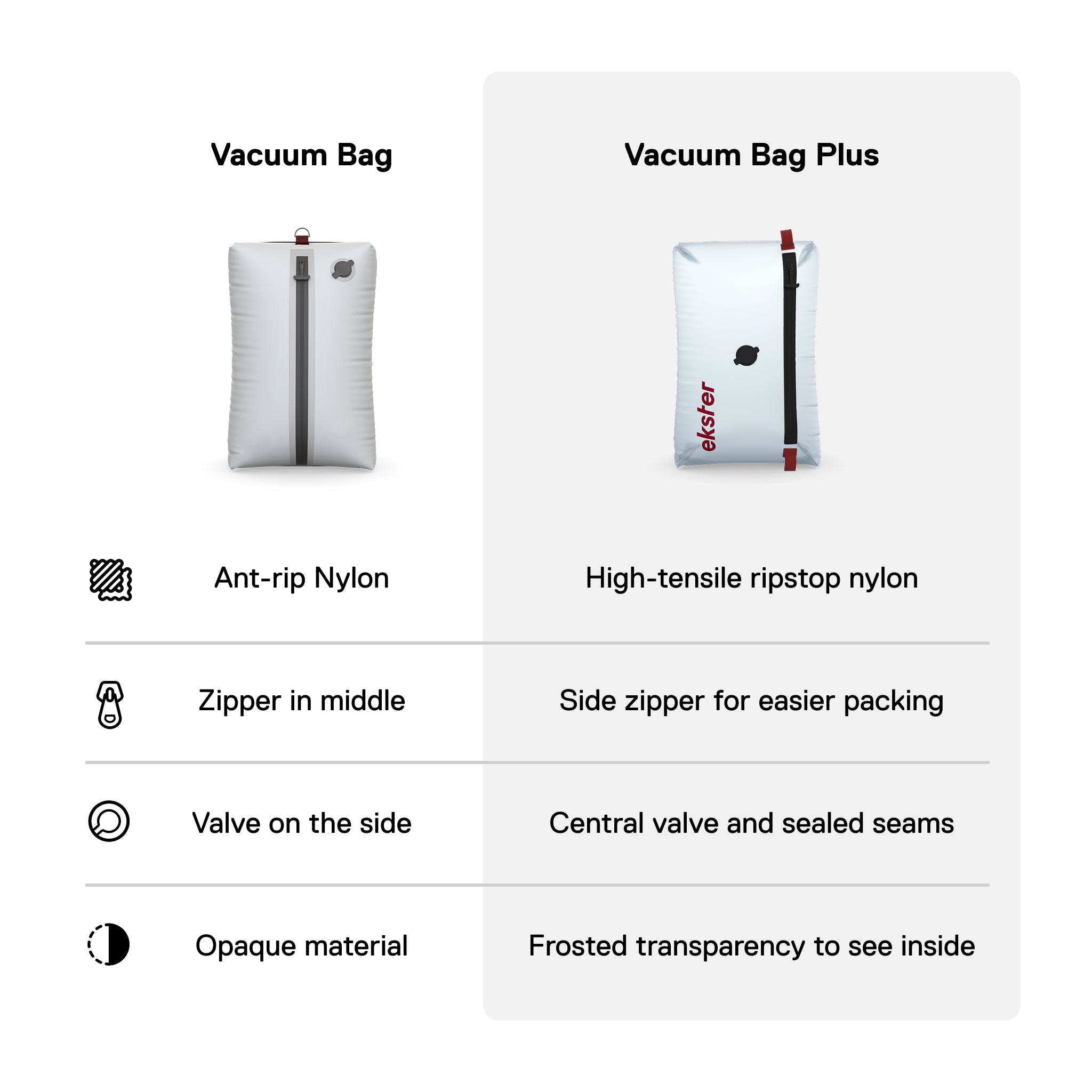 The Ekster TravelPack Vacuum Bags outperform cheap vacuum kits and are better than using no travel vacuum bags. Ekster's vacuum travel bags save packing space, fit in any size travel bag, keep clothes waterproof and odor-proof, and work with a portable air pump or any vacuum cleaner.