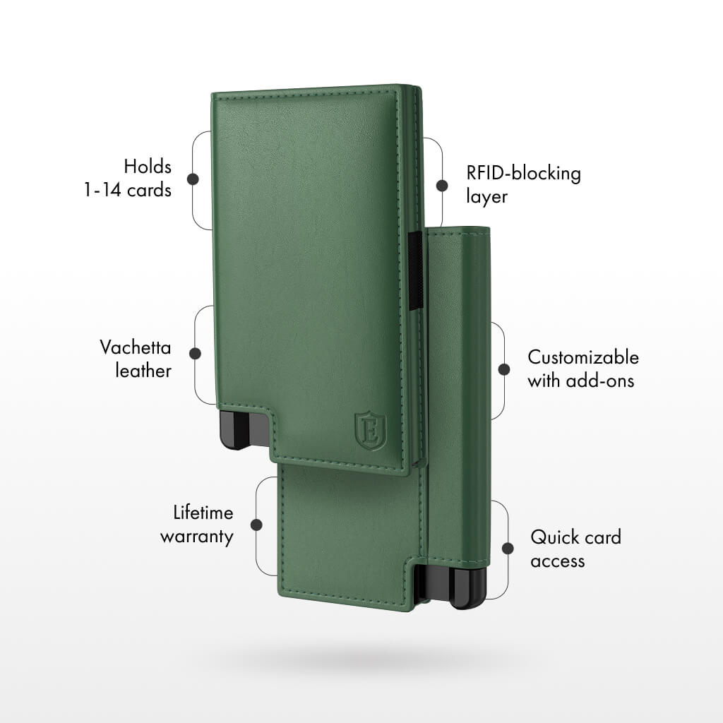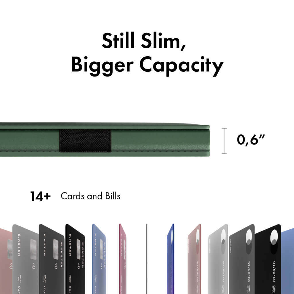 • Holds 1–14 cards and bills