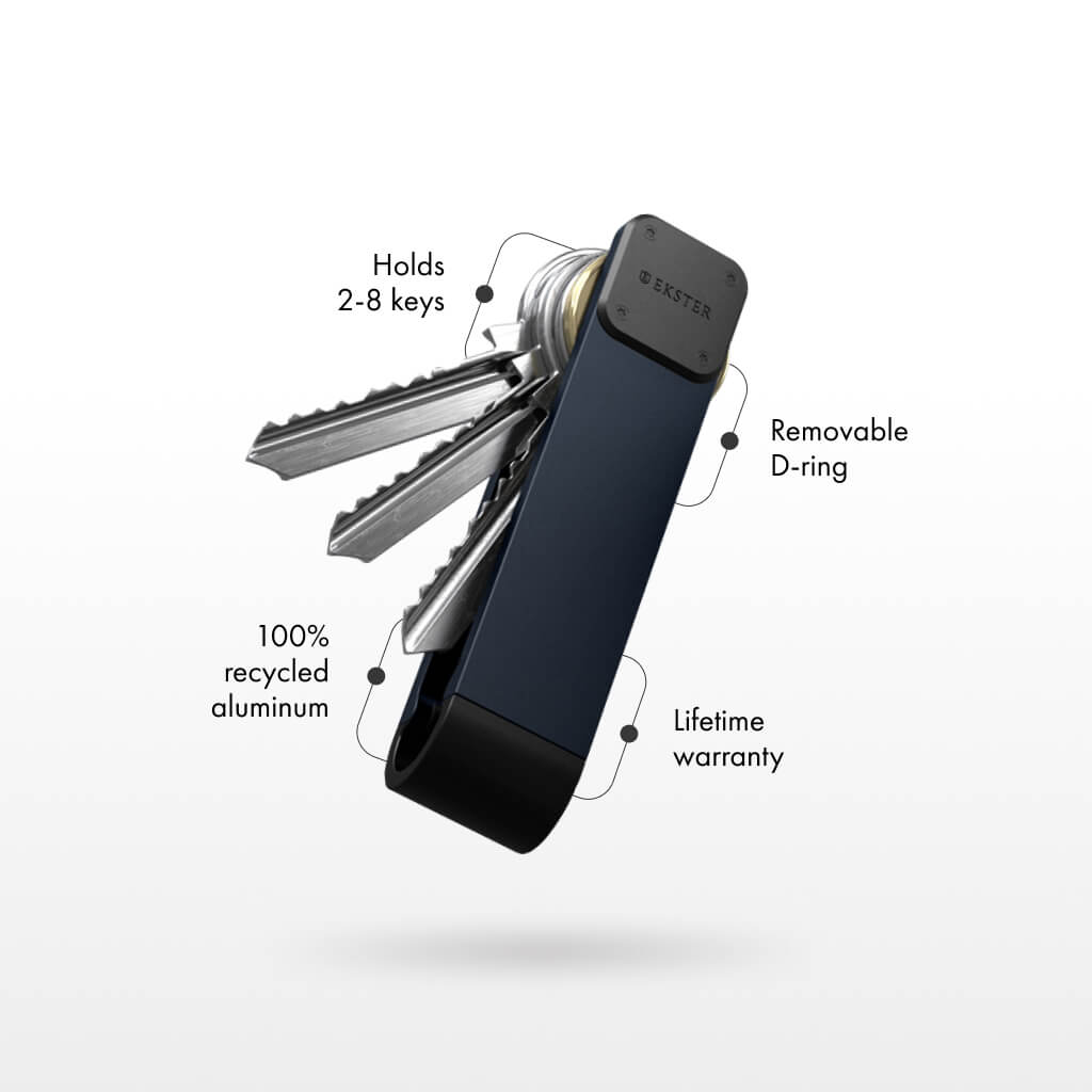 Organize your keys in a slim, silent stack that never jingles in your pocket. Enjoy quick, one-handed access and attach larger keys like car fobs with the removable D-ring.